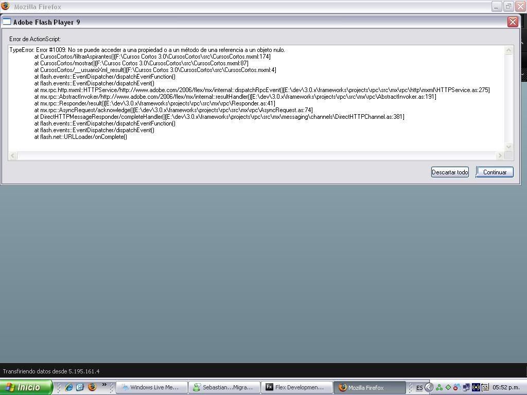 como dice el titulo tengo un problema al ejecutar swf de FLEX desde servidor remoto, la cosa es que tenemos montada la aplicación FLEX en el ordenador de mi compañero, la aplicación tiene un Login el cual funciona perfectamente el en ordenador de mi compañero pero no en el mio cuando intento ingresar a el por la red salen los siguientes errores